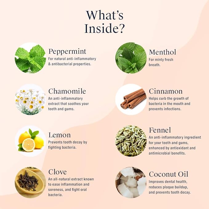 - MINTY FRESH BREATH: Created with refreshing peppermint, menthol, chamomile, cinnamon, lemon, fennel, clove and coconut oil extracts, our all-natural toothpaste keeps your breath minty fresh.