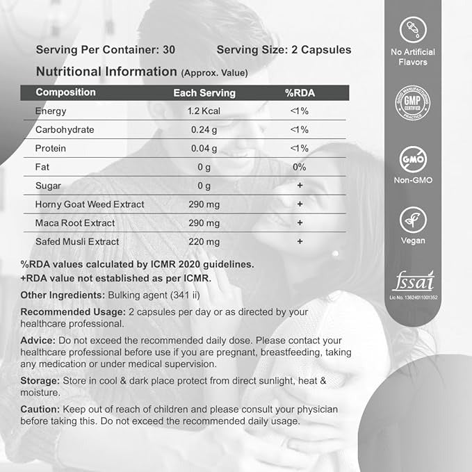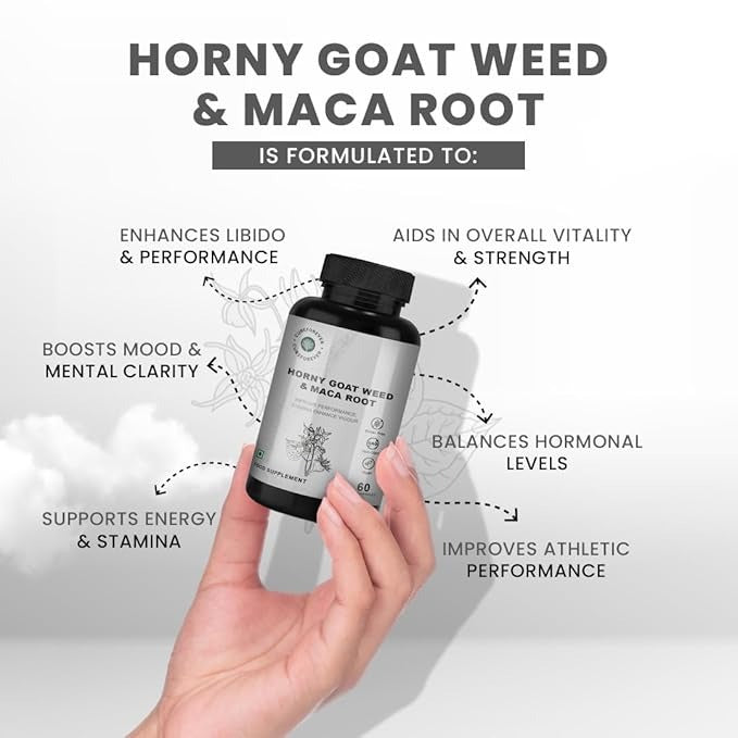 • Premium Herbal Blend : Each serving delivers 290 mg of horny goat weed extract, 290 mg of maca root extract, and 220 mg of safed musli extract. Sourced from high-quality plant extracts, this carefully formulated supplement ensures a balanced blend of botanicals. Encapsulated in HPMC veg capsules, this product is designed for individuals looking for a natural addition to their lifestyle. The easy-to-digest formula is free from artificial fillers, ensuring a clean and convenient supplement choice.