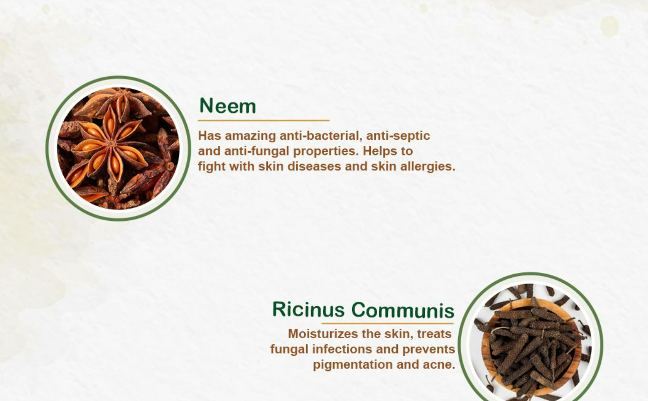 - Neem: Anti-bacterial, anti-septic, and anti-fungal properties