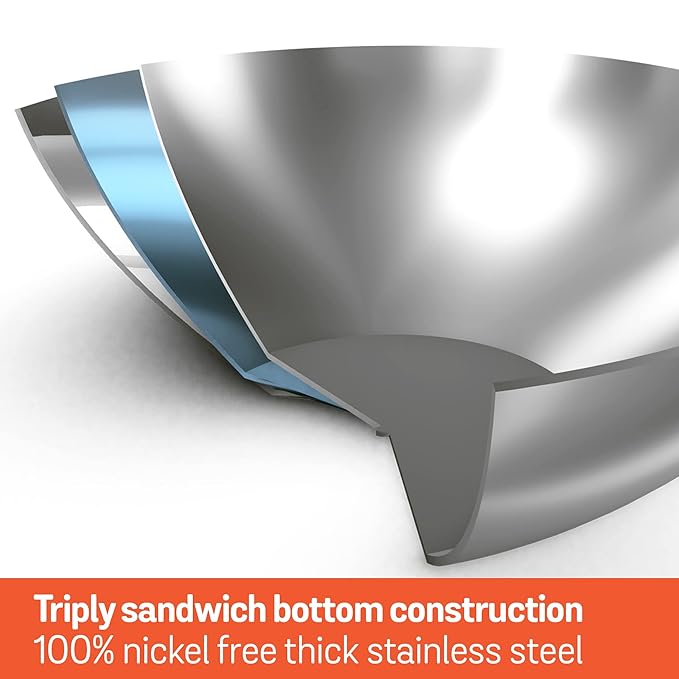 • Three Layers, Three Benefits: Core of quick and even heating Aluminium sandwiched between 2 layers of 100% safe non-toxic food grade Stainless Steel on one side and induction compatible, magnetic Stainless Steel on the other.