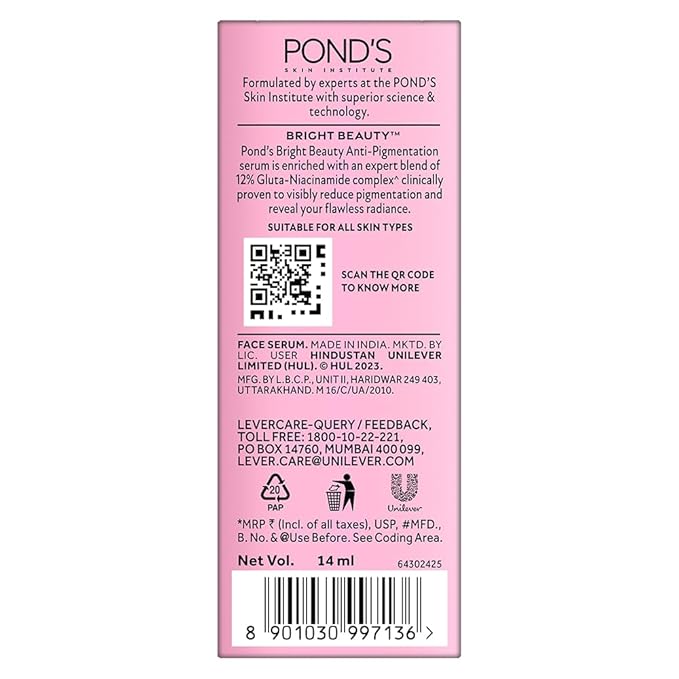 • Pond's Bright Beauty Spot-less Glow Serum gives your skin a bright, hydrated glow.