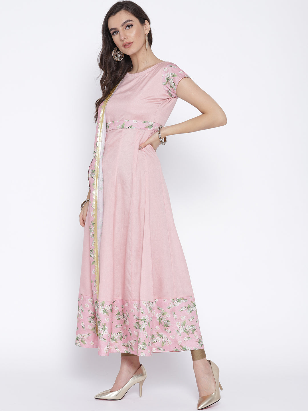 - Pink solid Anarkali kurta with printed detail, has a round neck, short sleeves, flared hem