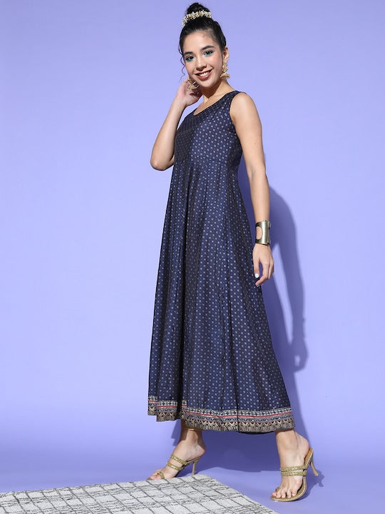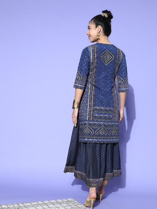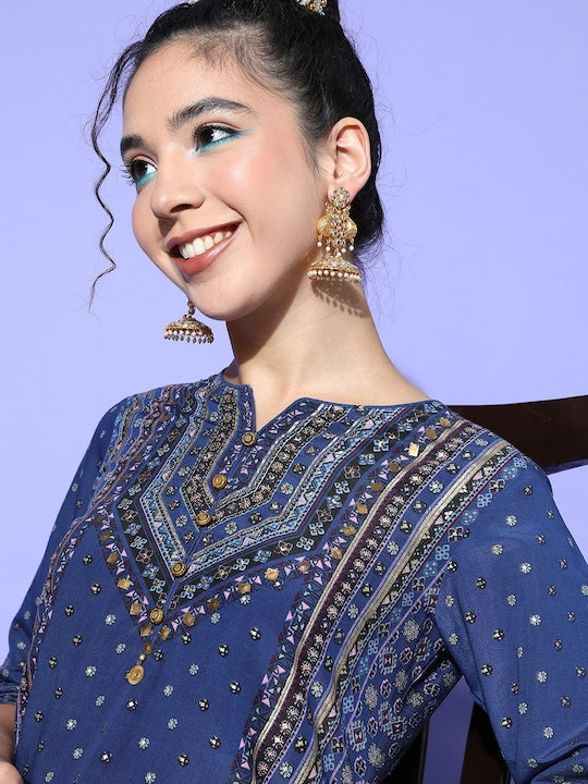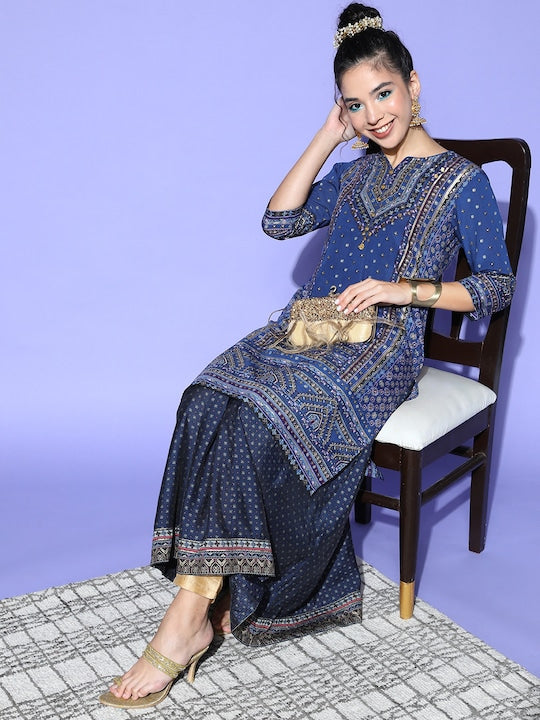 Juniper Women Navy Blue Silk Print Mix Kurta