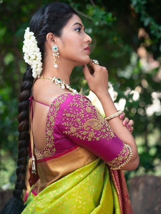 • The blouse worn by the model might be for modelling purpose only. Check the image of the blouse piece to understand how the actual blouse piece looks like.