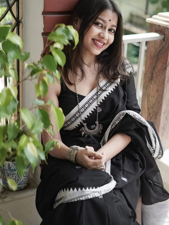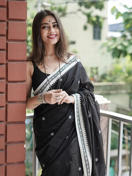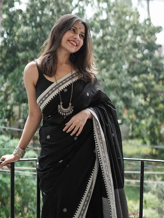 - Black and silver-toned banarasi saree