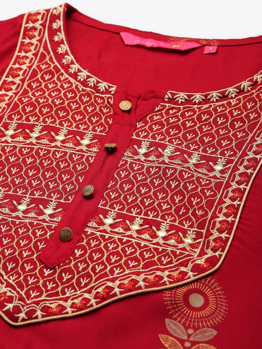 - Maroon and Golden printed straight kurta with embroidered detail, has a round neck, button closure, three-quarter sleeves, straight hem, and side slits
