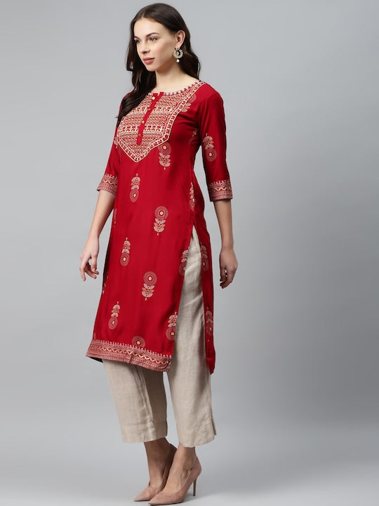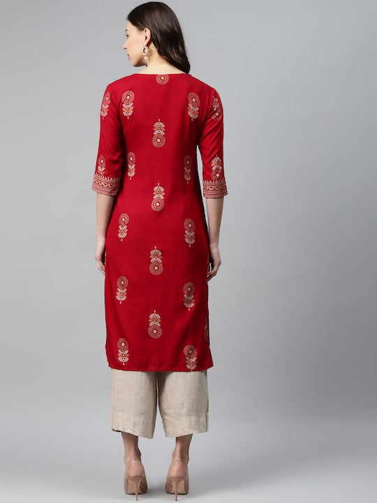 Anubhutee Women Maroon & Golden Printed Straight Kurta
