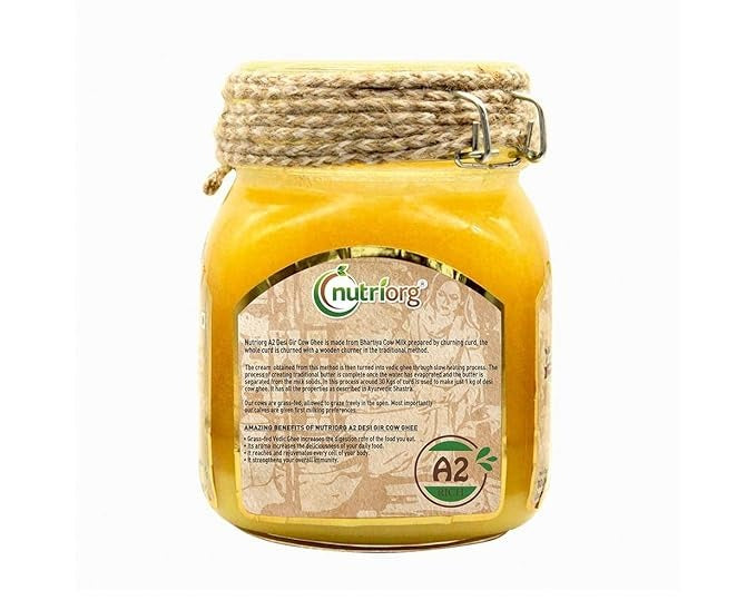 - 100% Pure A2 Gir Cow Ghee: Nutriorg A2 Gir Cow Ghee is a premium, hand-churned ghee made using the authentic Vedic Bilona method from the A2 milk of grass-fed Gir cows. Known for its rich flavor and nutritional benefits, this ghee is made in small batches to ensure the highest quality and purity.