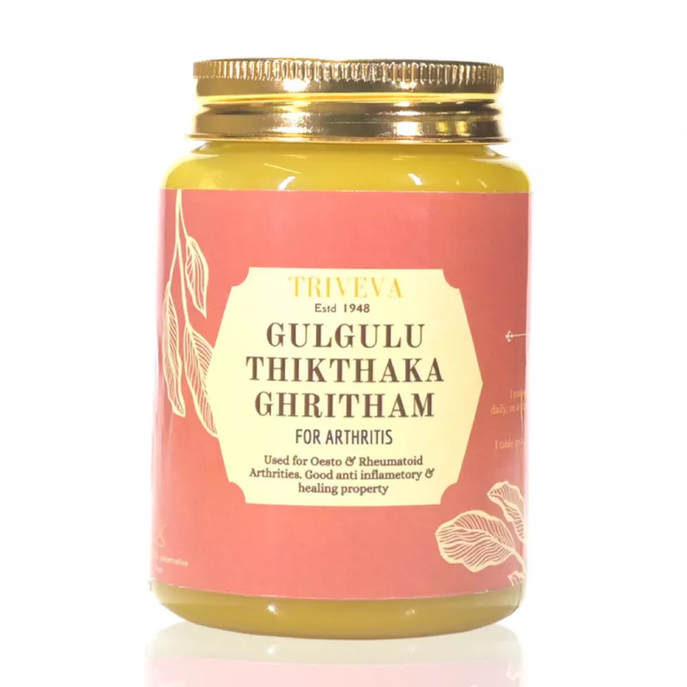 - Triveva’s Gulguluthikthakam Ghritham is a medicated ghee formulated with pure cow’s ghee as base.
