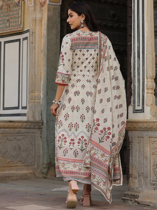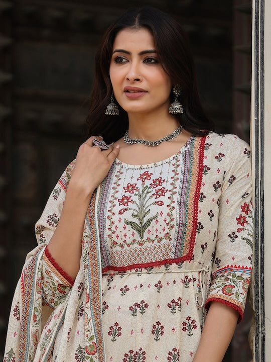 Juniper Beige & Red Floral Printed Cotton Ethnic Dress With Dupatta
