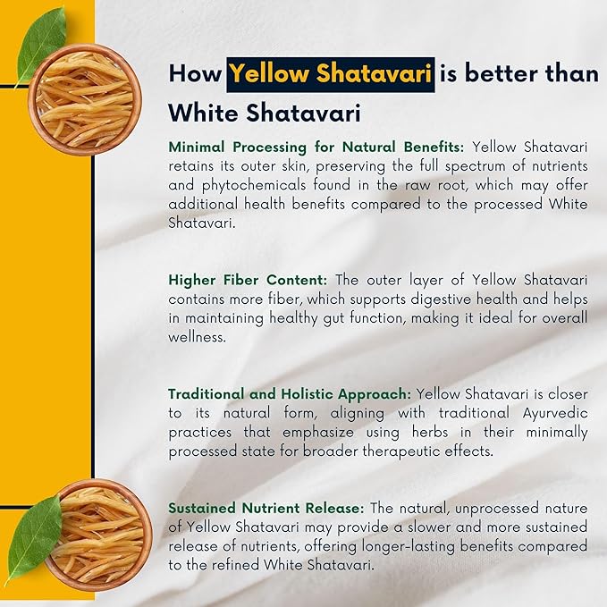 • Our yellow Shatavari Root is sourced from farms directly and it's 100 % Natural and free from pesticides, chemicals, and additives.