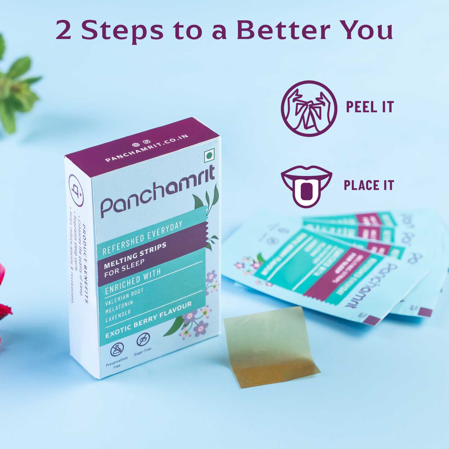 - Panchamrit Melting Strip for Sleep in Exotic Berry Flavor is designed to support relaxation and aid in achieving a natural transition to sleep.