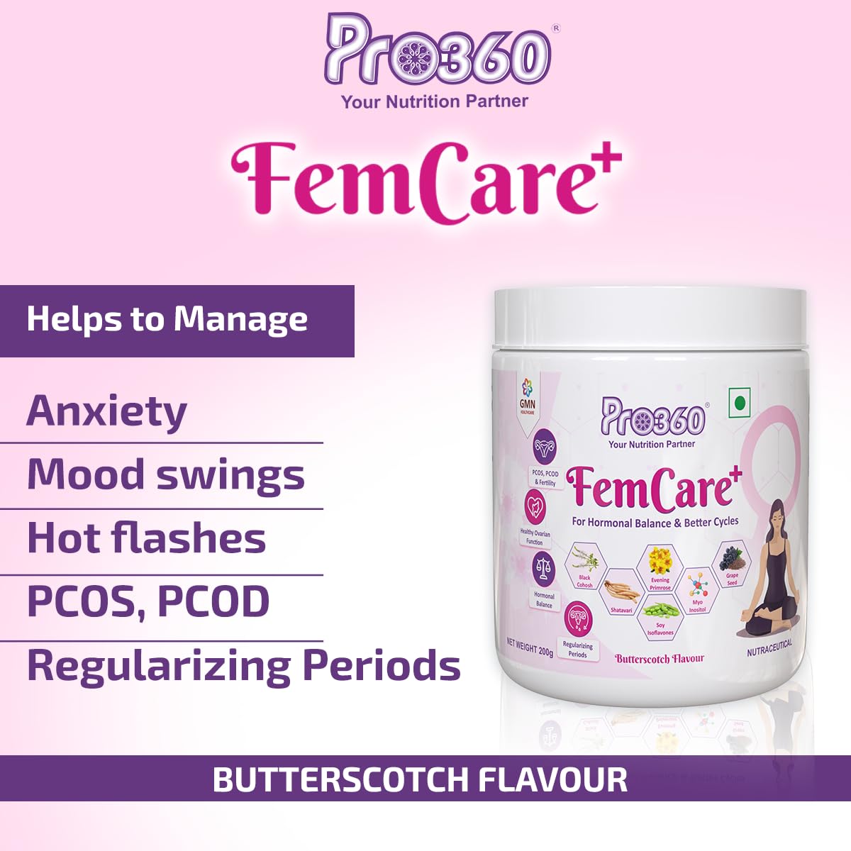 • Pro360 femcare+ pcos, pcod women wellness nutritional supplement for their hormonal balance and better cycles which alleviate anxiety, mood swings, hot flashes.