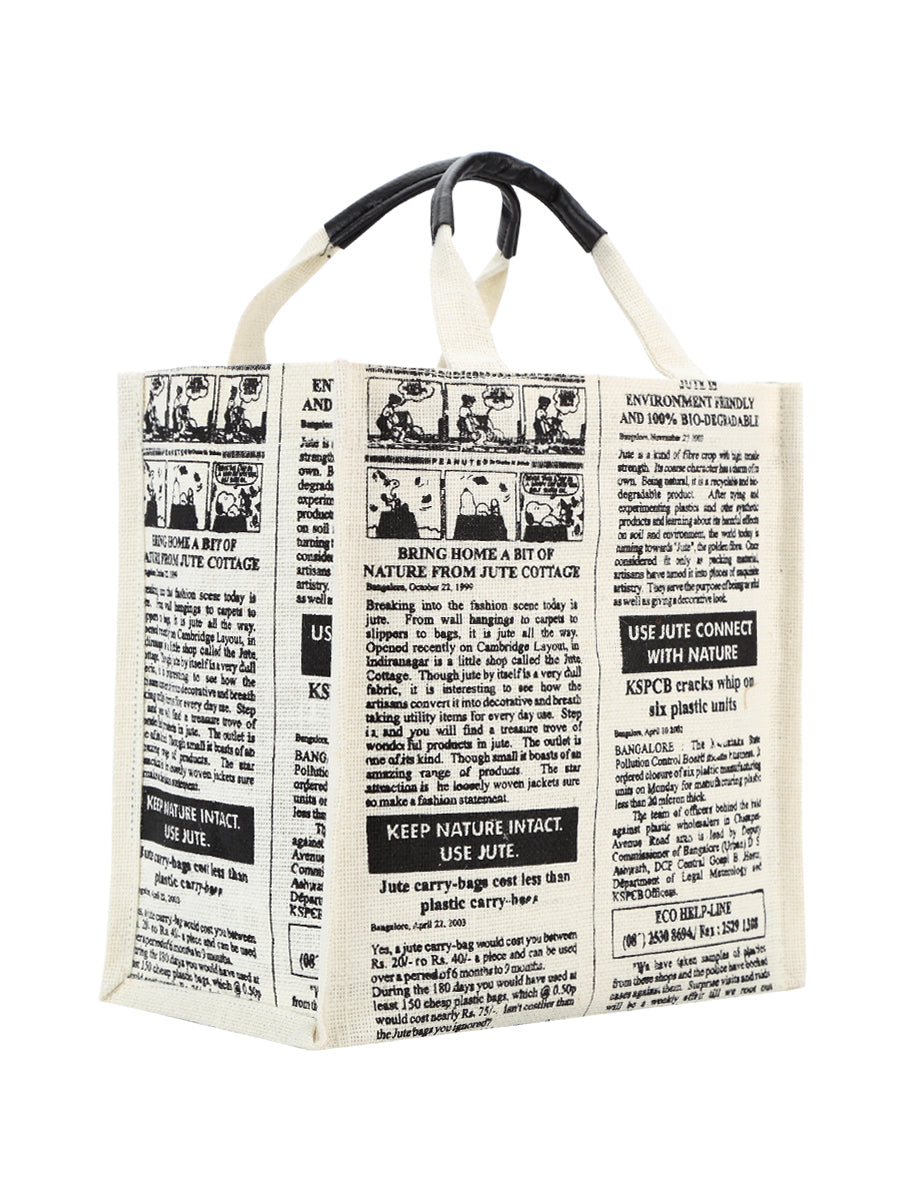 • PRODUCT DETAILS - Made out of 100% natural export premium quality Jute fabric laminated inside for extra strength and water resistance. This jute bag is both Eco-friendly and stylish. Equipped with a single compartment secured by a hook and loop fastener for carrying your essentials. Handles made out of 100% jute are reinforced with faux leather PU for better grip. Trendy newspaper graphics hand screen printed for an elegant look.