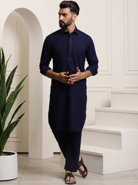 Sojanya Men Navy Blue Solid Pathani Kurta with Salwar