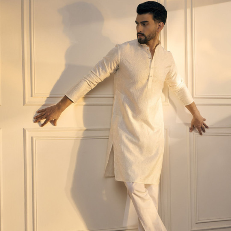 Anouk White Striped Embroidered Sequinned Mandarin Collar Straight Kurta