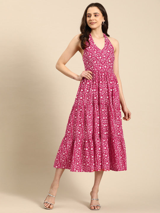 Anayna Floral Print Halter Neck Fit & Flare Pure Cotton Midi Dress