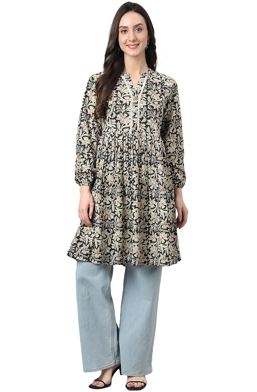 Janasya Women's Black Cotton Floral Print Flared Tunic