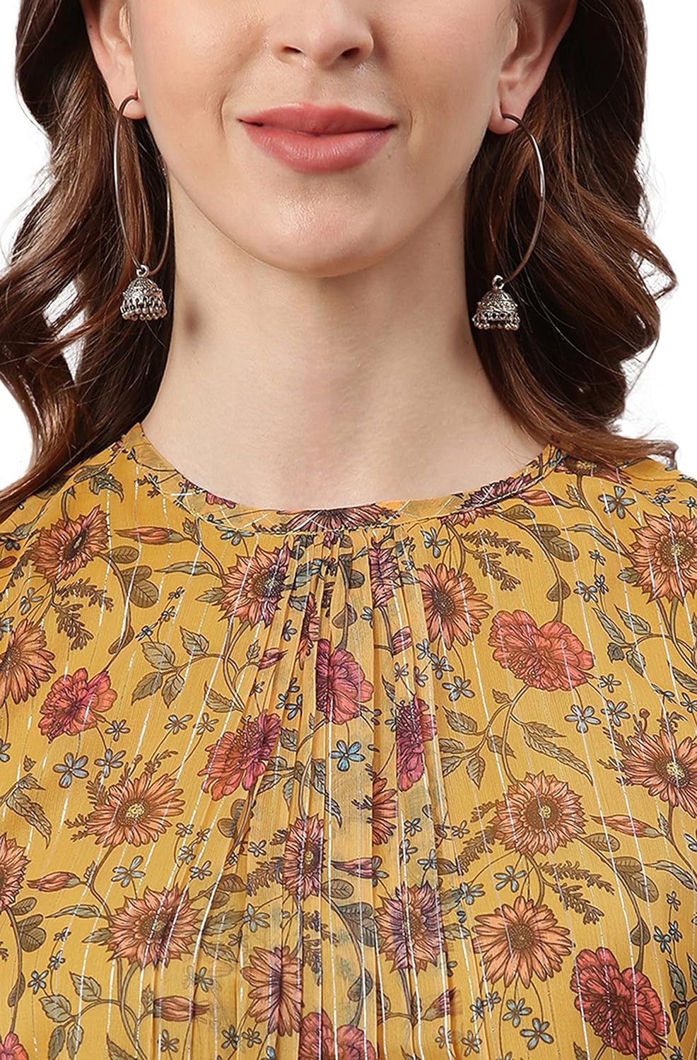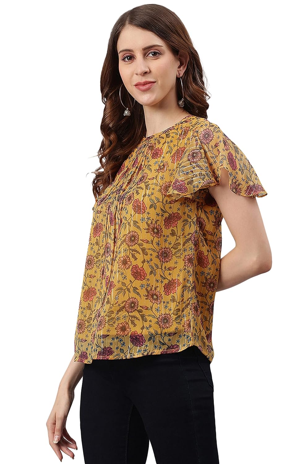 • Elevate your wardrobe with this chic 24" length Top from the Premium Gold collection, featuring Half Sleeves and crafted from luxurious Poly Georgette material.