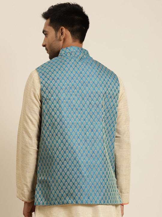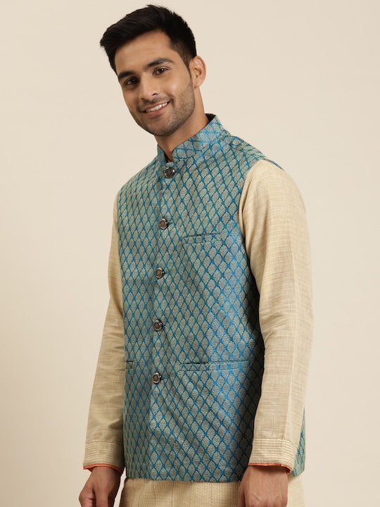 Sojanya Men Blue and Beige Jacquard Woven Design Silk Nehru Jacket