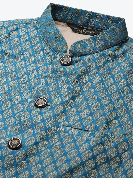 Sojanya Men Blue and Beige Jacquard  Woven Design Silk Nehru Jacket