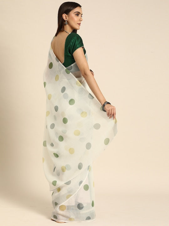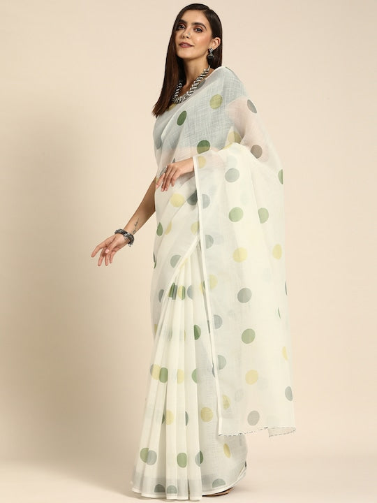 Anouk Off White & Green Linen Blend Printed Bhagalpuri Saree