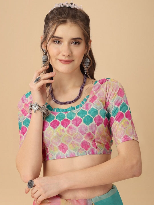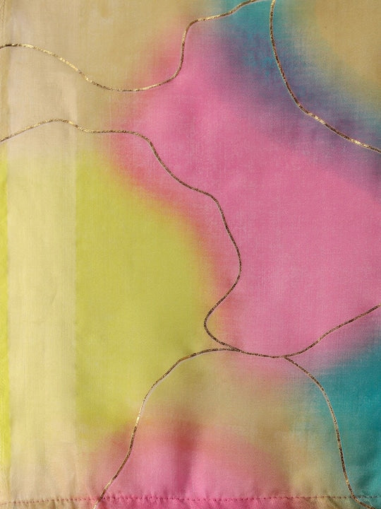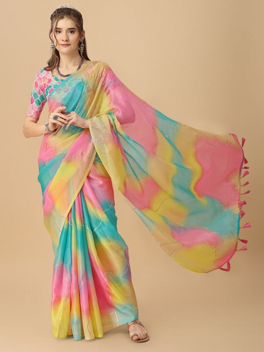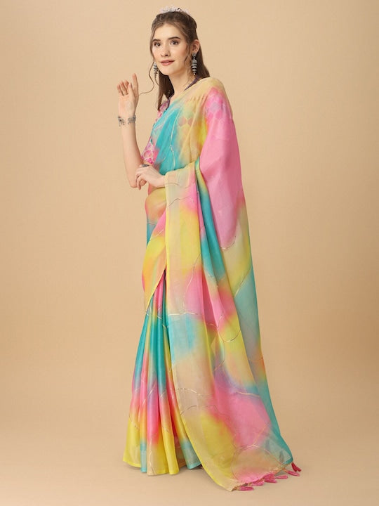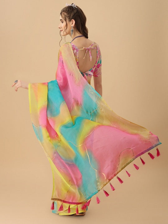 Sangria Colorblocked Printed Organza Saree With Tassel