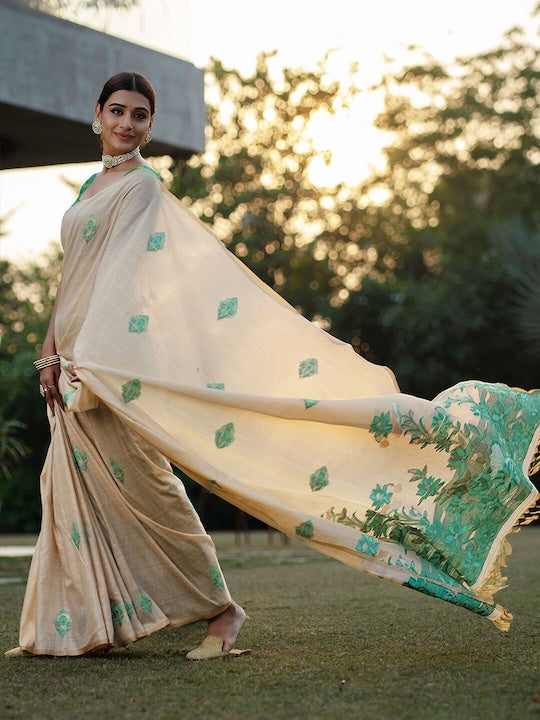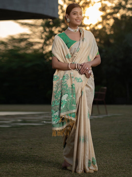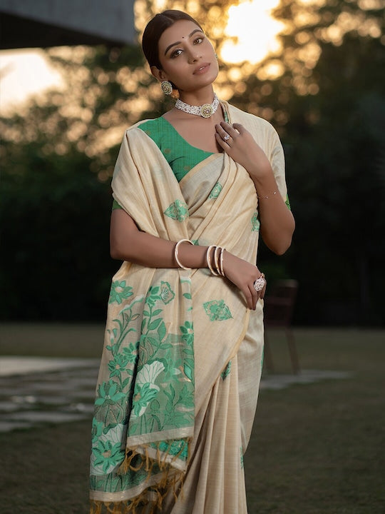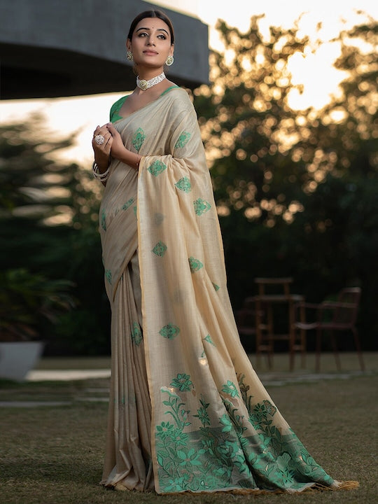 Satrani Beige Floral Woven Design Zari Banarasi Saree
