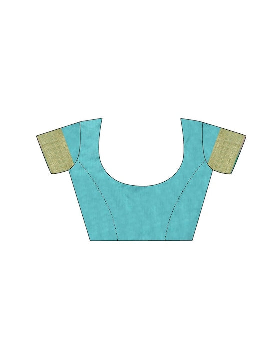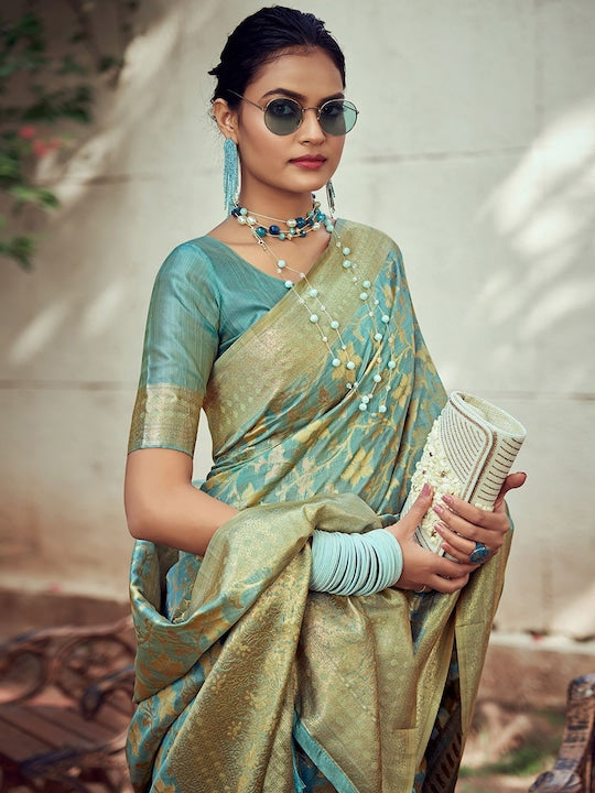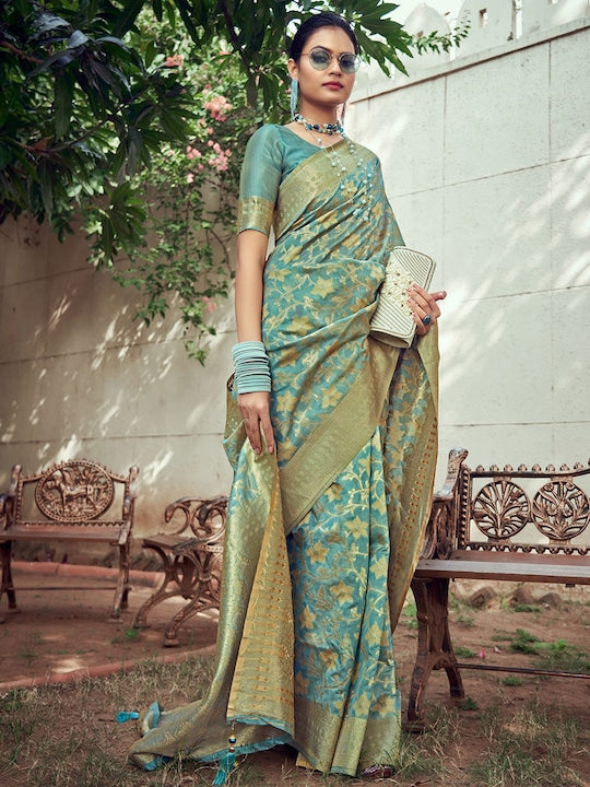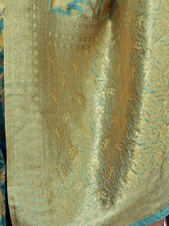 - Turquoise blue and gold-toned banarasi saree