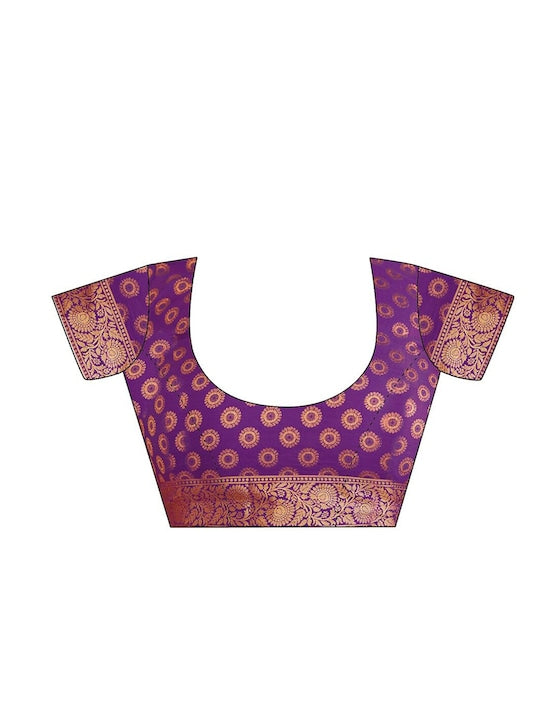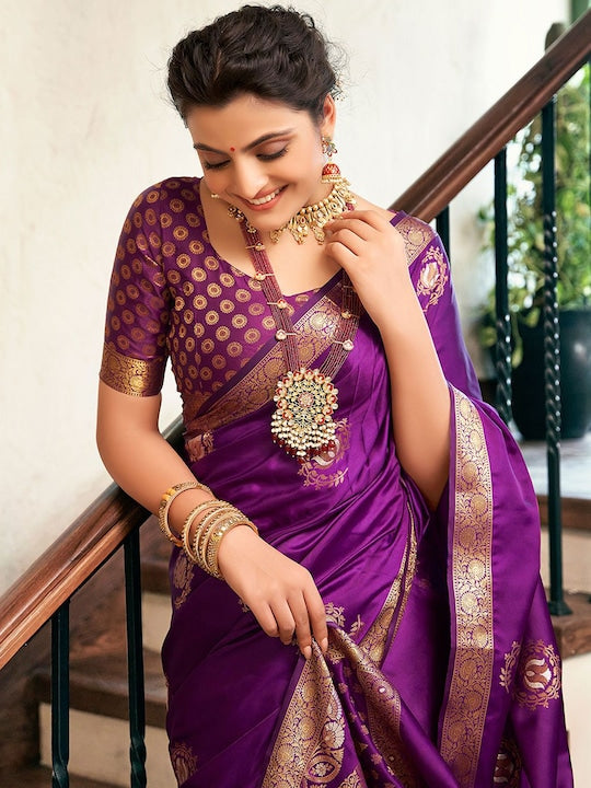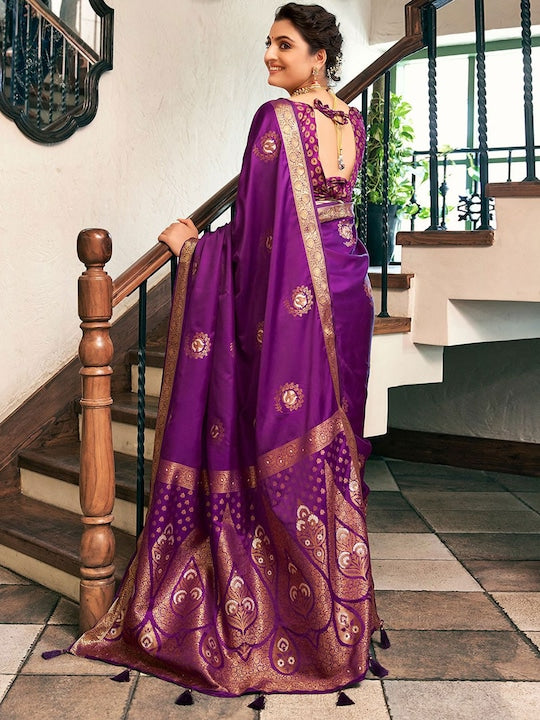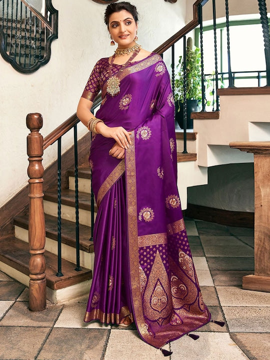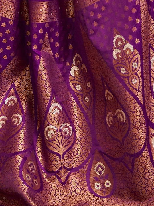 Satrani Purple & Gold Toned Floral Woven Design Zari Jacquard Banarasi Saree