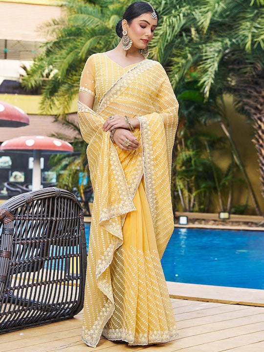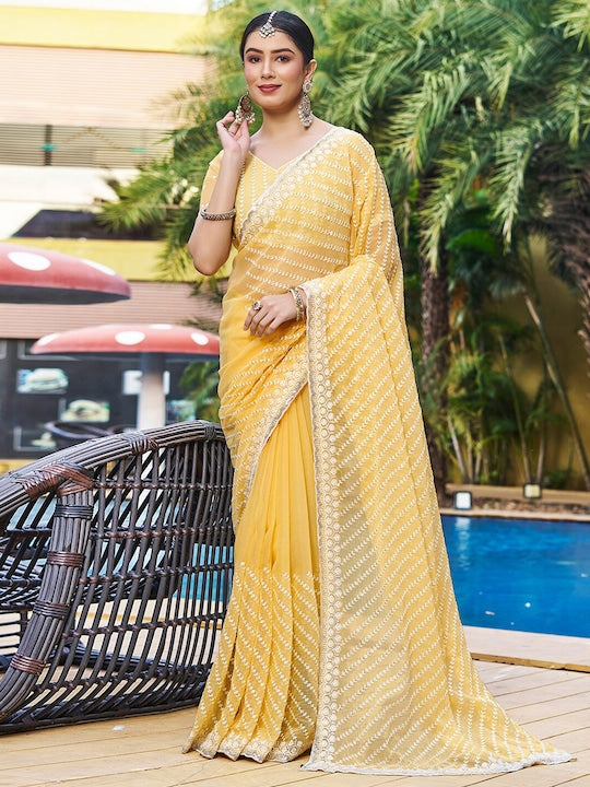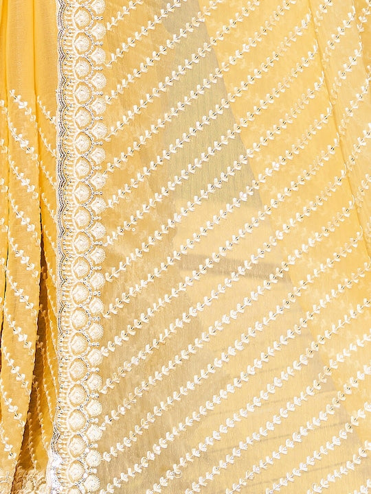 Satrani Striped Embroidered Chiffon Fusion Saree