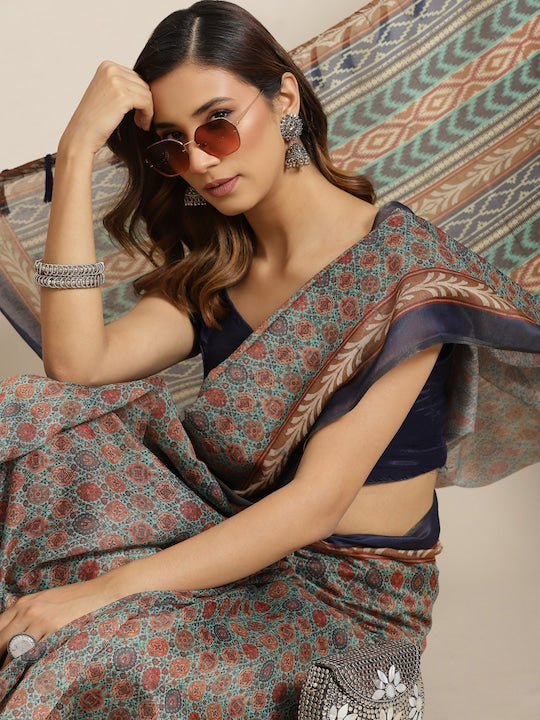 Silk Land Beige & Navy Blue Kalamkari Saree