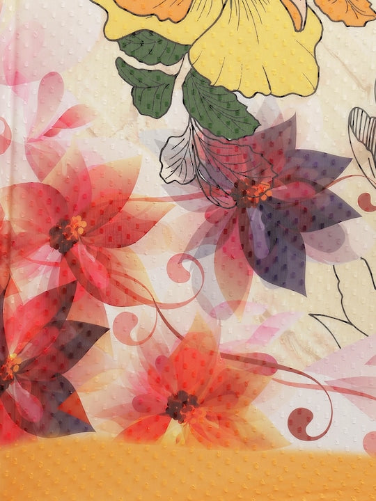Silk Land Cream-Coloured & Green Floral Print Dobby Weave Chiffon Saree