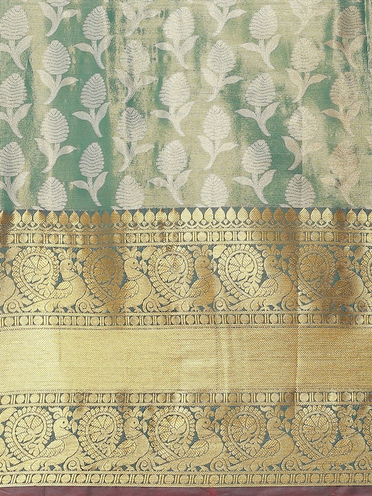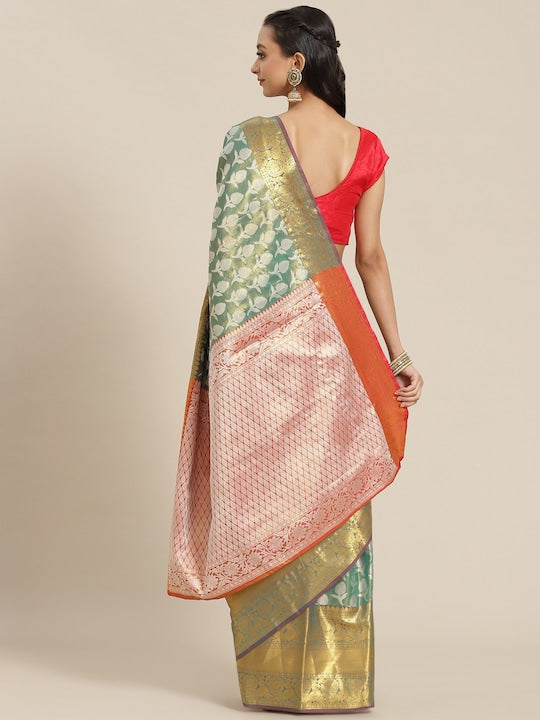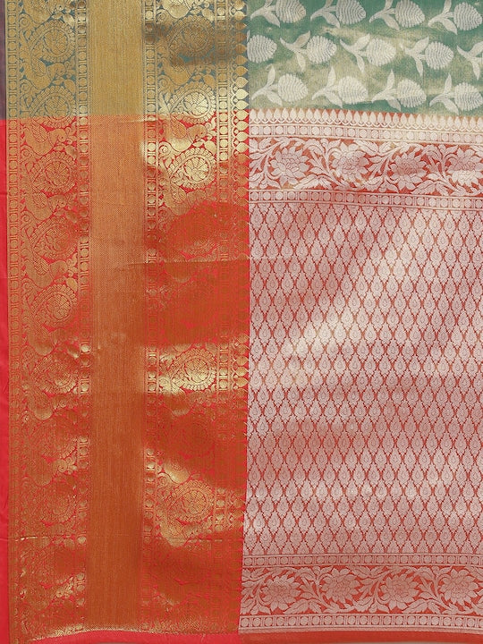 Silk Land Green & Orange Ethnic Motifs Zari Brocade Banarasi Saree