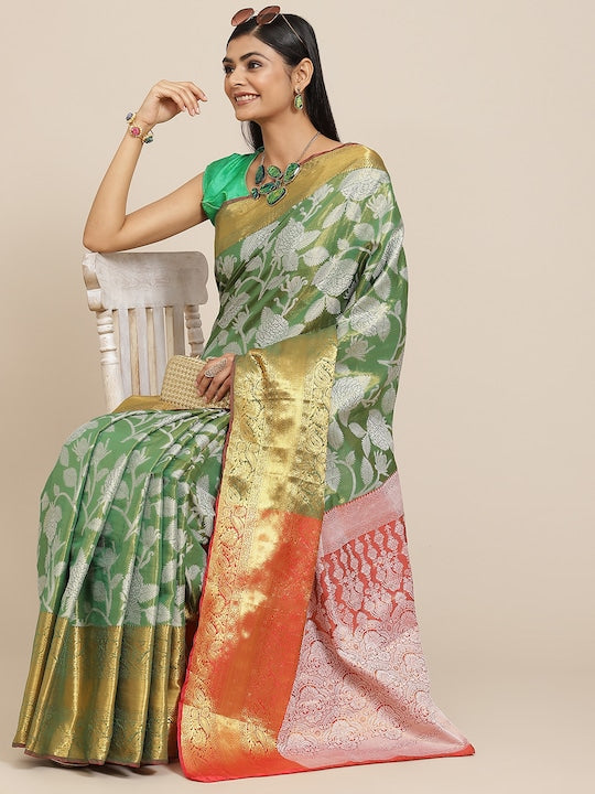 Silk Land Green & White Ethnic Motifs Zari Ikat Saree