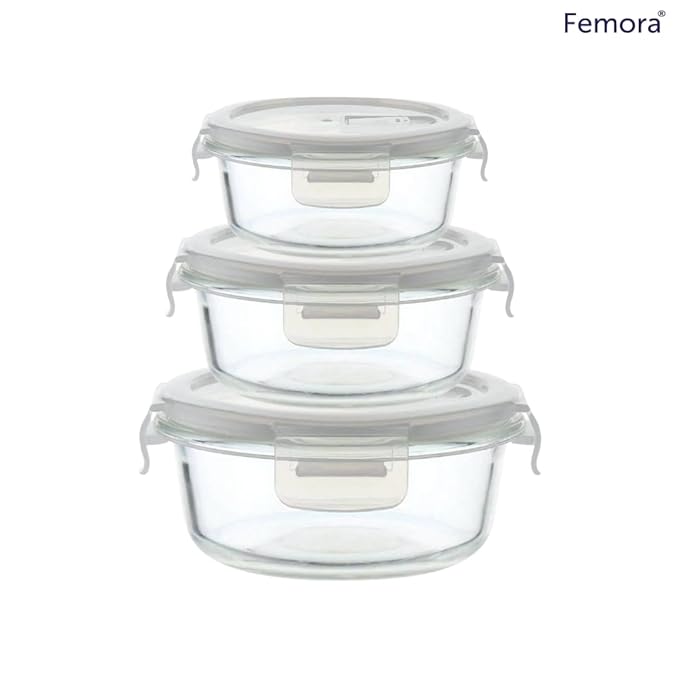 Femora Borosilicate Glass Containers for Kitchen | Storage Box for Kitchen With Air Vent Lid | Set of 3 | 380 Ml, 580 Ml, 940 Ml