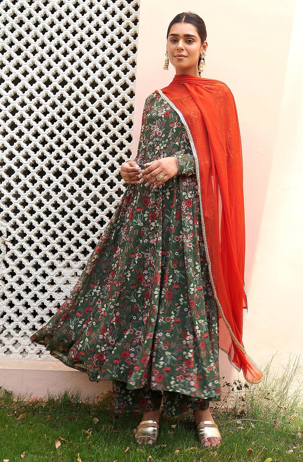 - Embrace the festive allure in this exquisite Bottle Green Georgette Anarkali Kurta set featuring a captivating digital floral print. The kurta, with a grand length of 48 inches, is paired with a 39-inch palazzo, both crafted from luxurious Georgette fabric. The full sleeves and Anarkali design add a touch of elegance, making it perfect for festive occasions.