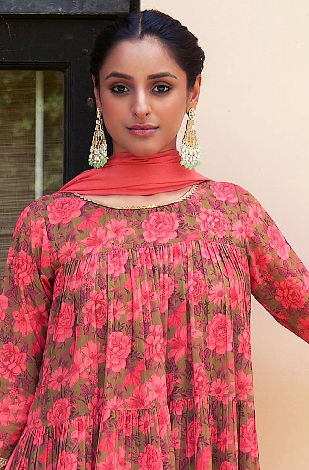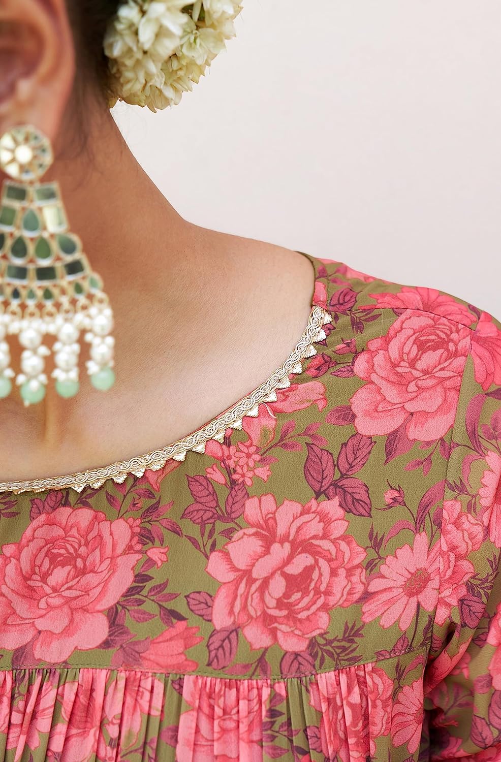 • Embrace the festive charm in this Olive Georgette Tiered Kurta set adorned with a captivating digital floral print. The 50-inch kurta pairs harmoniously with a 38-inch palazzo, both crafted from luxurious Georgette fabric. The tiered design and 3/4th sleeves add an elegant touch, making it perfect for festive occasions.