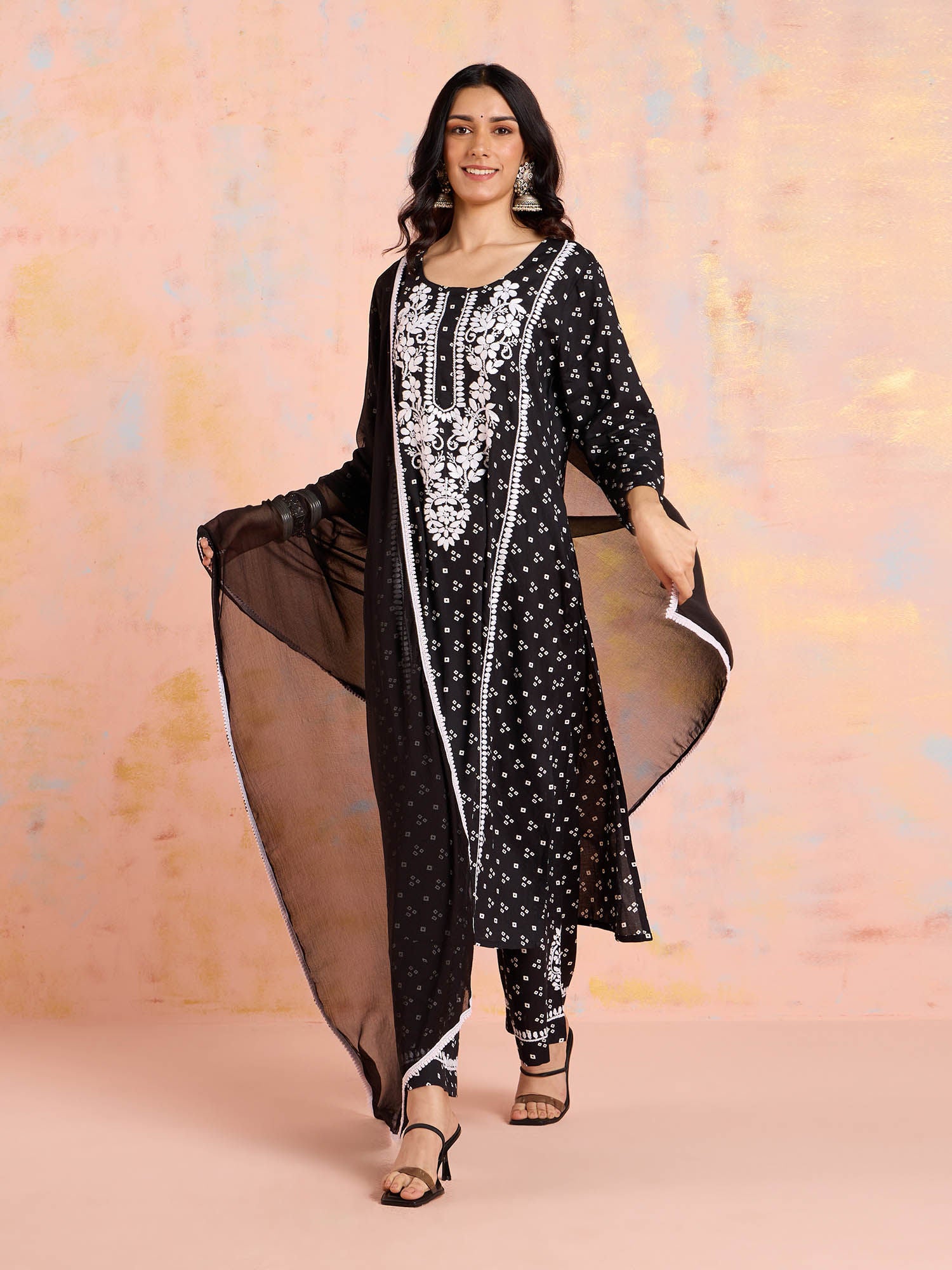 Elevate your style with this handcrafted Black Embroidered Salwar Suit Set from Likha, designed to make you stand out at gatherings and special occasions. Crafted with meticulous attention to detail, this ensemble features exquisite embroidery, a comfortable round neck design, and three-fourth sleeves, ensuring you look your fashionable best.
