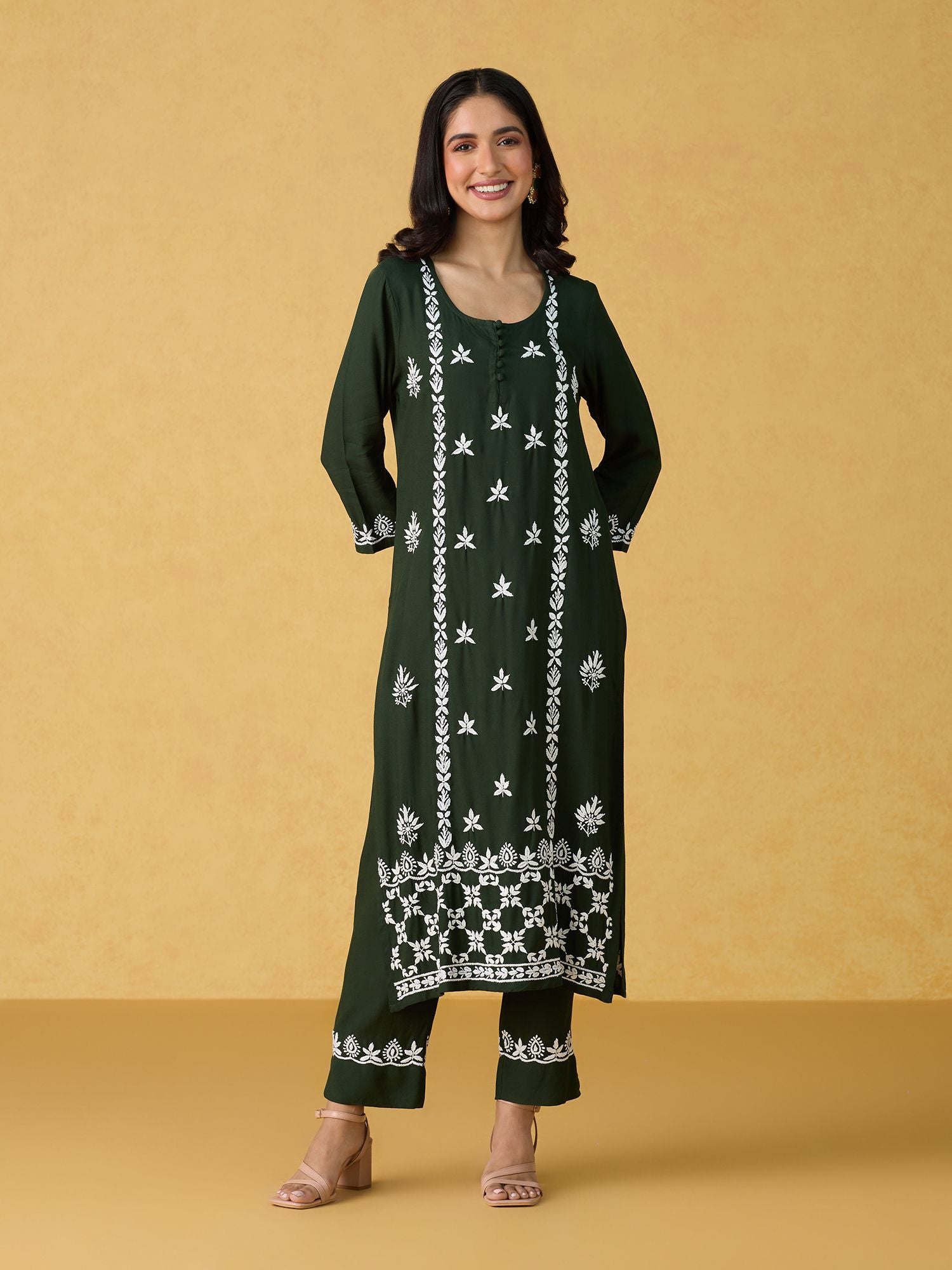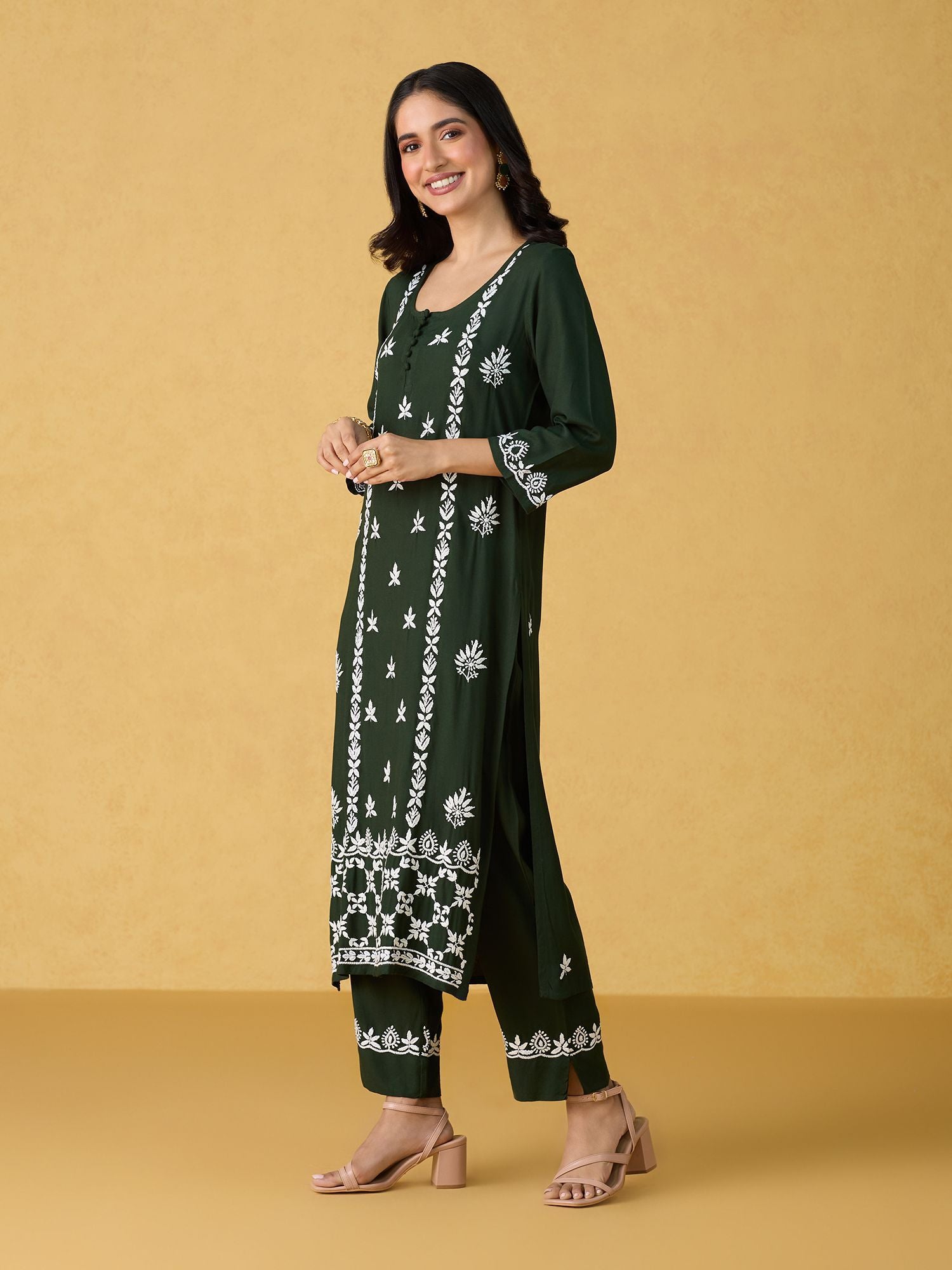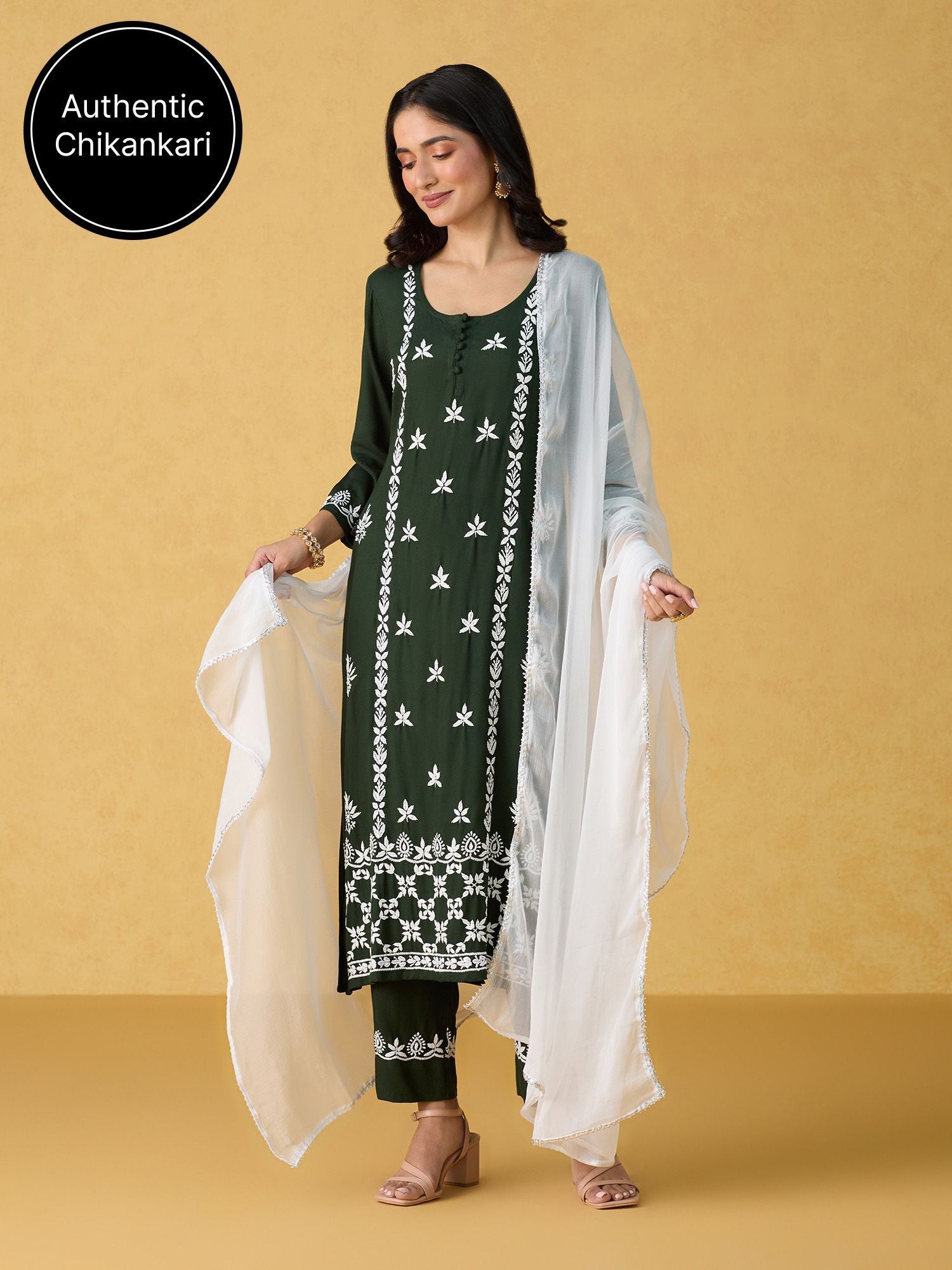 Likha Green Chikankari Kurta Pant & Dupatta (Set of 3)