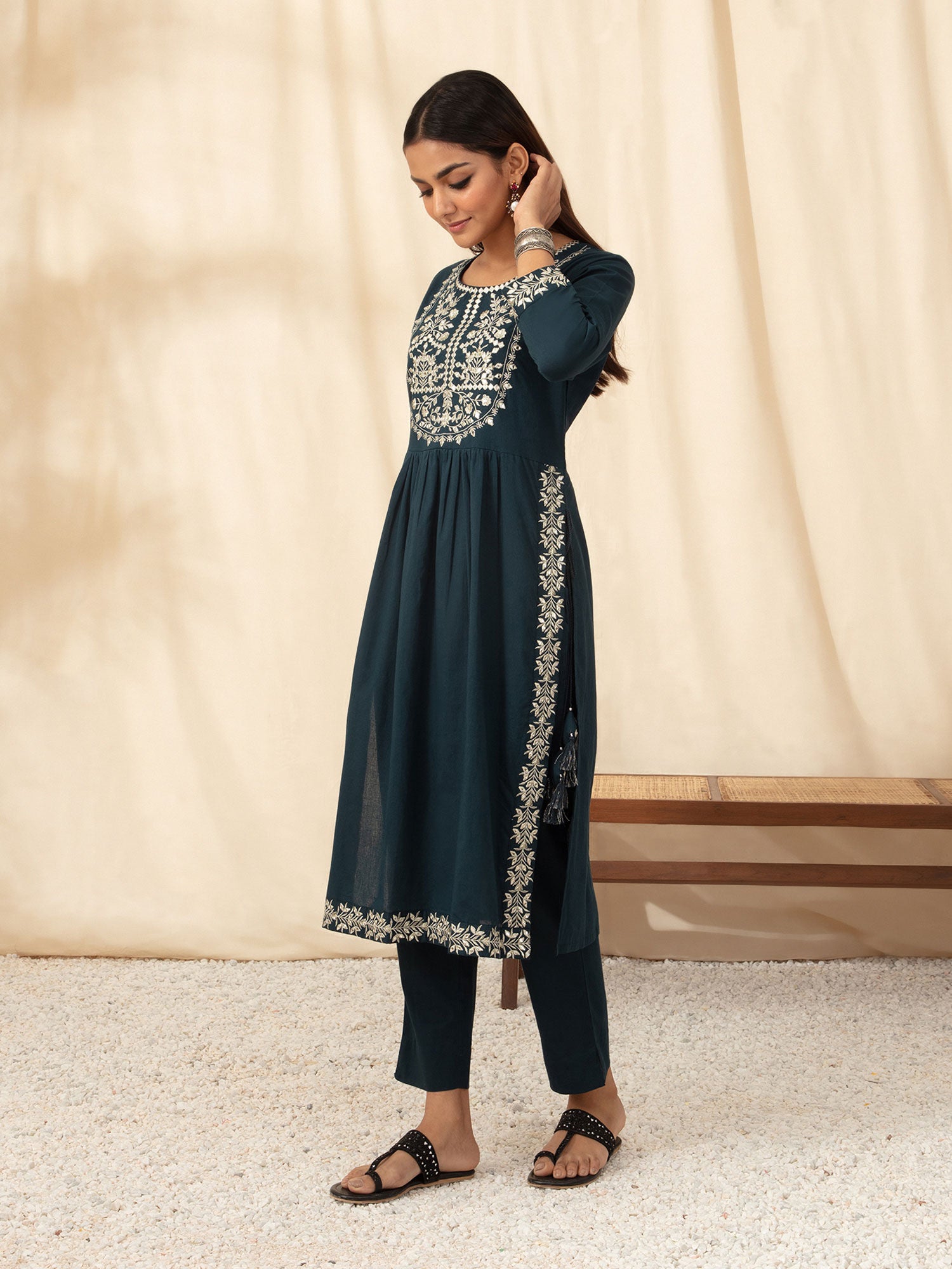 • Step out in style with this comfortable cotton kurta and bottom set, perfect for casual occasions. The kurta features a timeless solid/plain pattern with elegant Gota and Cord Dori embroidery, ensuring you look absolutely stunning. The fit and flare design adds to its appeal, making it a versatile choice for your casual wardrobe.