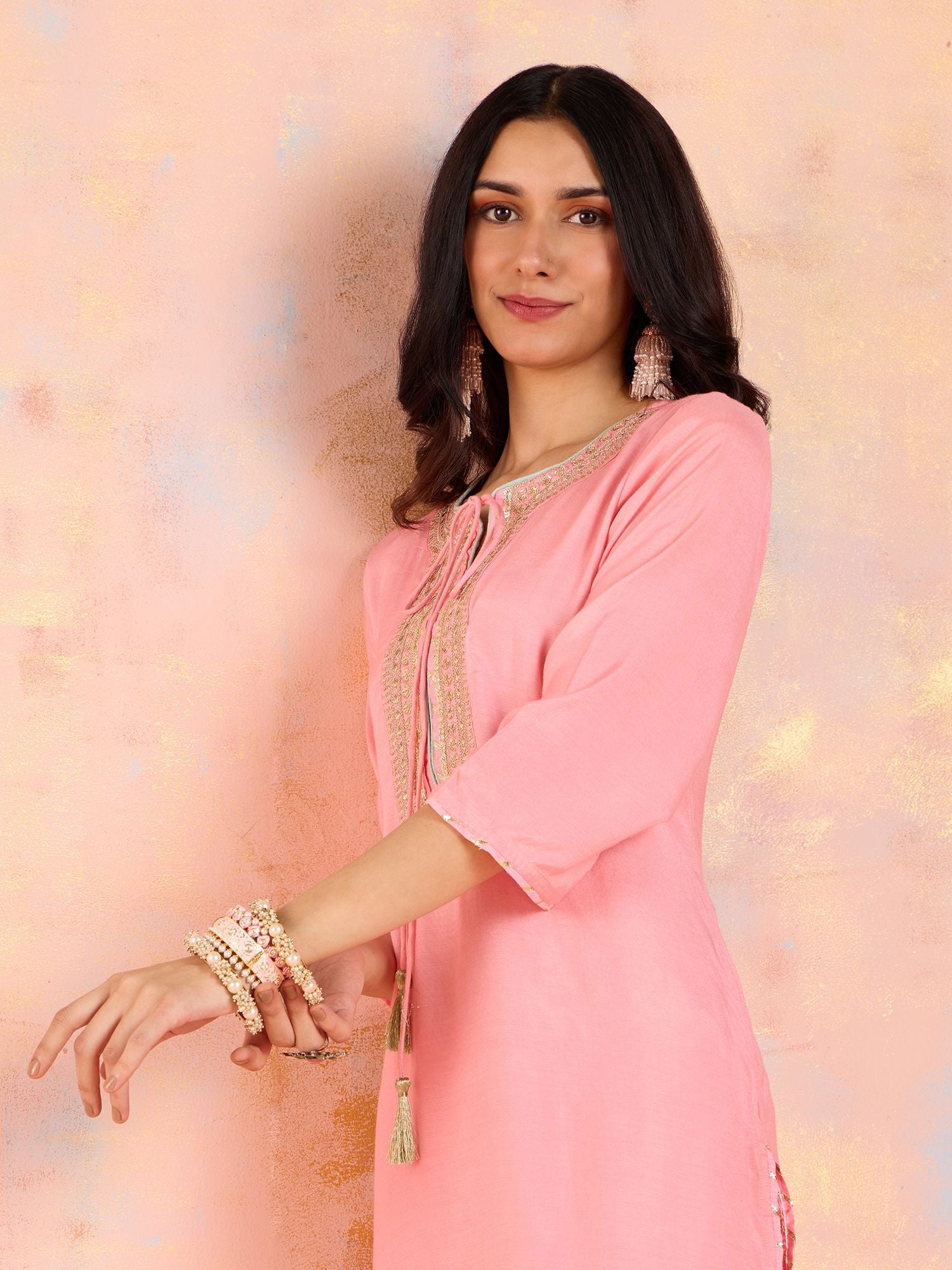 • The set includes a solid shantoon kurta with subtle golden yoke embroidery, paired with a dhoti pant. The kurta is elegantly highlighted with Gota lace on the apple hem and sleeves, adding an exquisite touch to the ensemble.