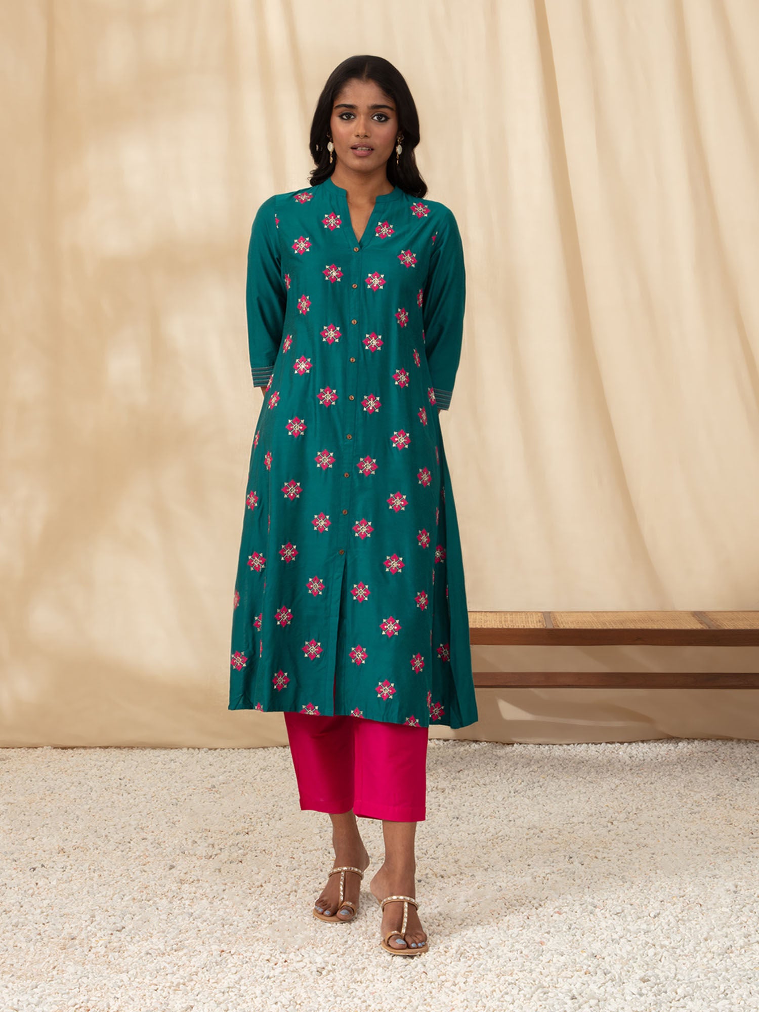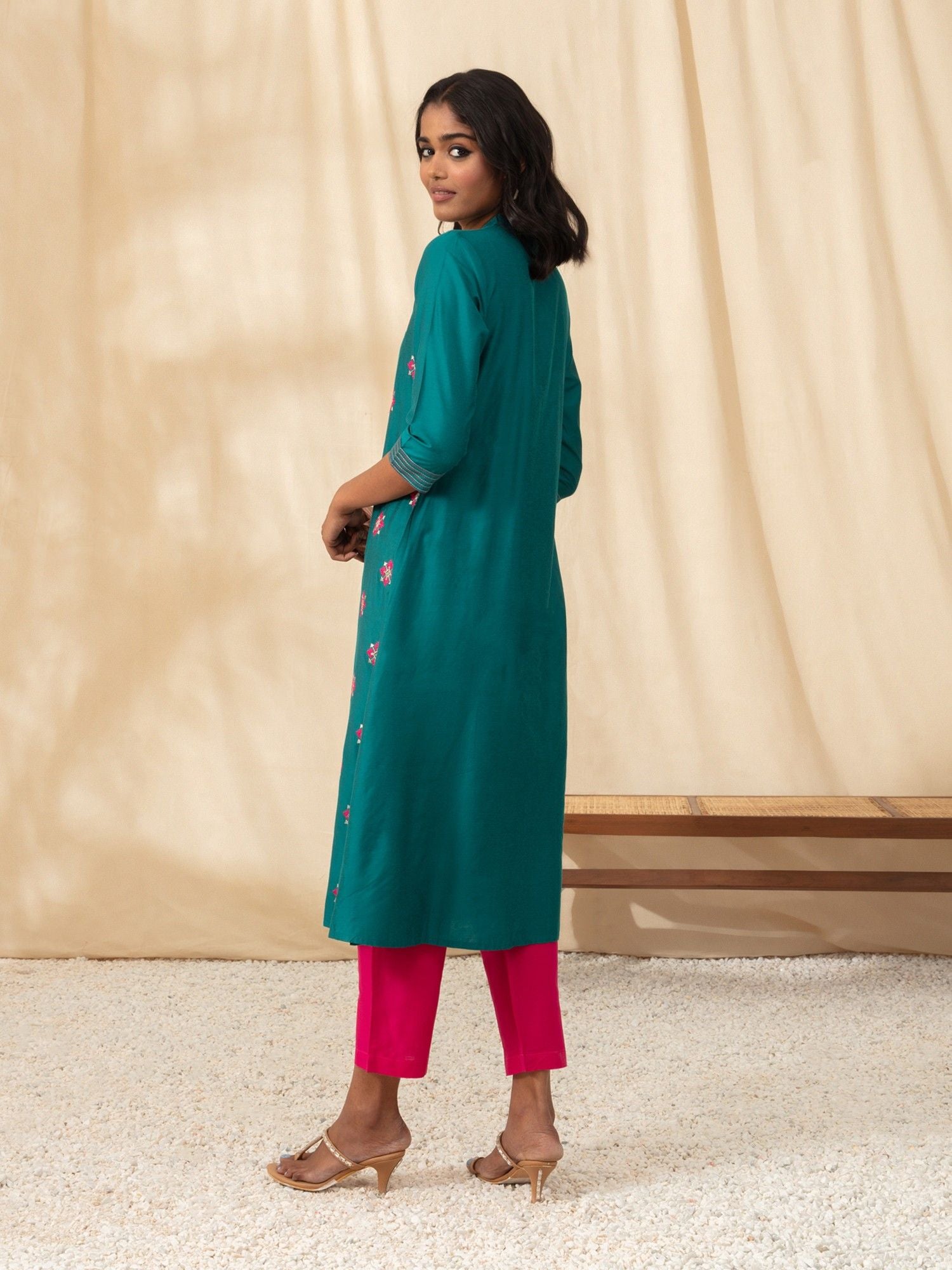 • Elevate your festive attire with this stunning blended fabric kurta and pant set. The kurta features intricate embroidery, a comfortable fit, and a stylish mandarin neck. Perfect for celebrating in style and comfort.