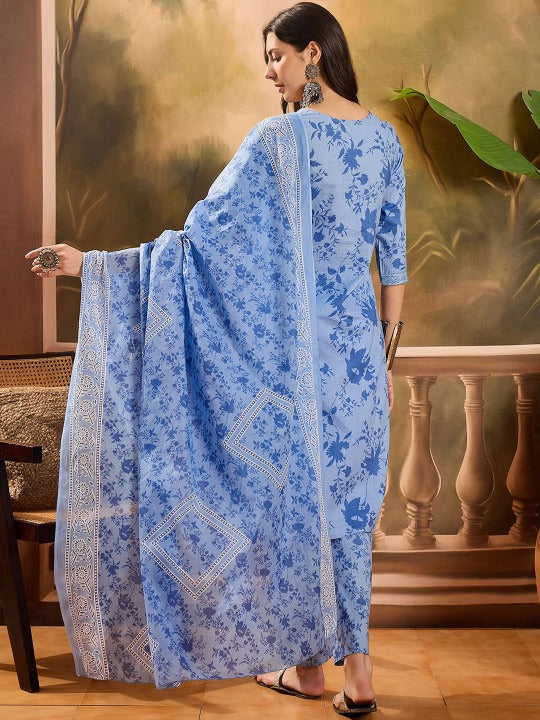 Sangria Floral Printed Notch Neck Pure Cotton Straight Kurta With Trousers & Dupatta