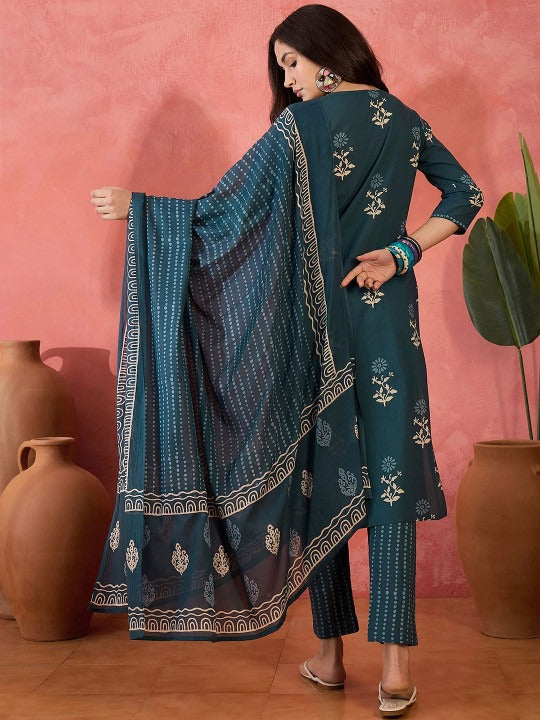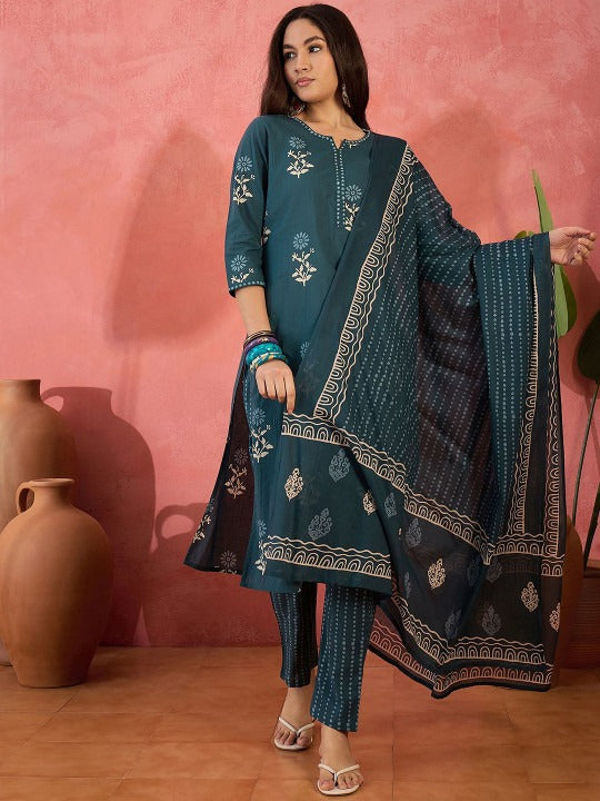 Sangria Floral Printed Straight Kurta & Trousers With Dupatta