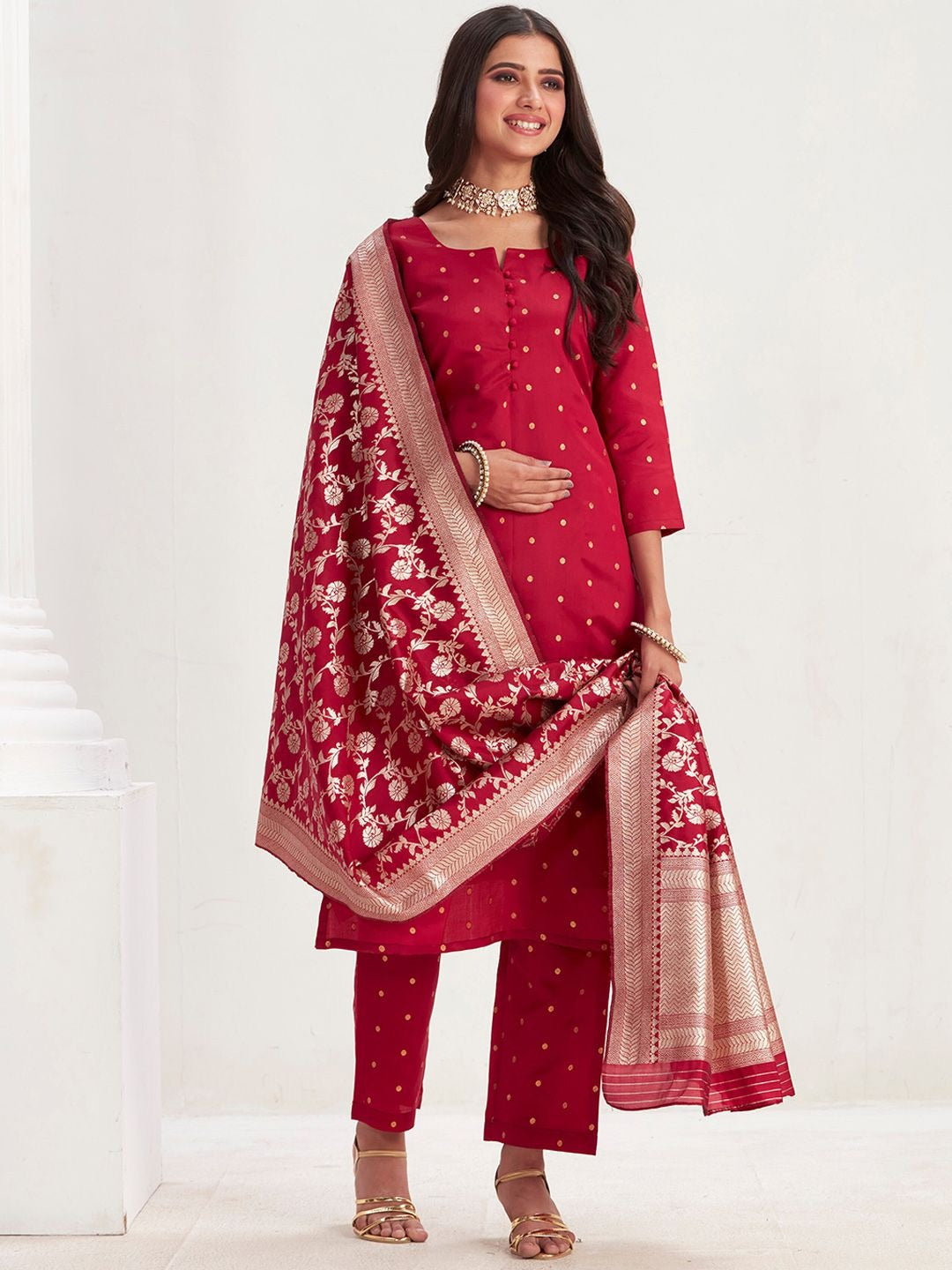 • Kurta set consists of kurta, trousers and dupatta