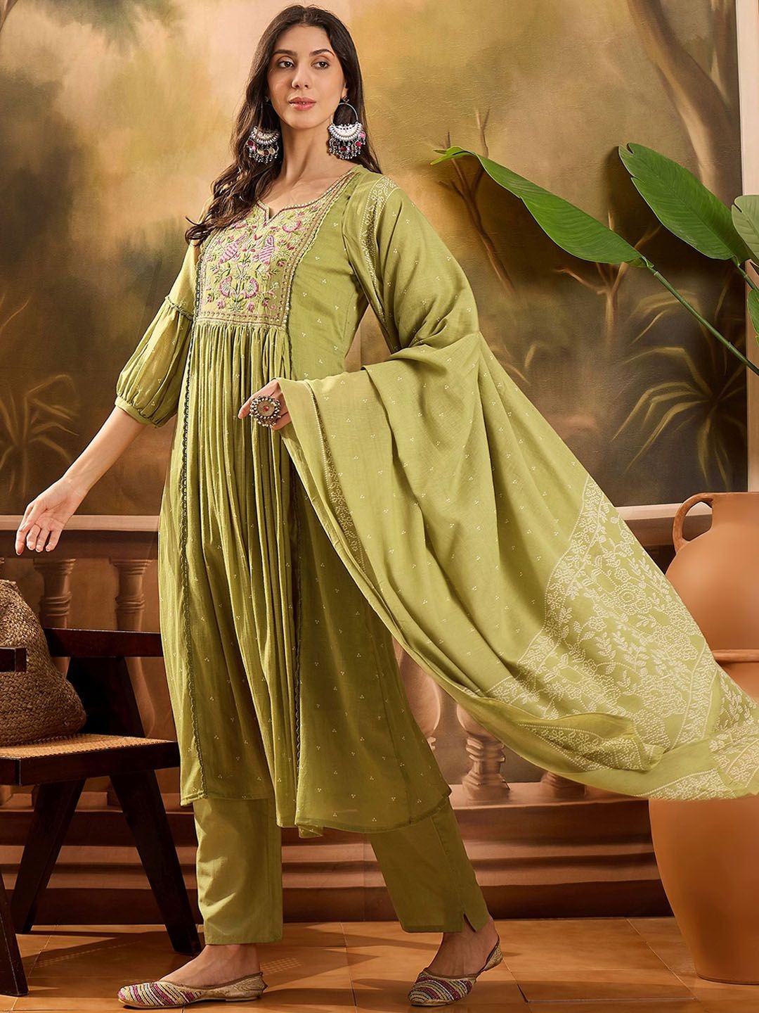 • Green, Pink, White Embroidered Kurta with Trousers & Dupatta