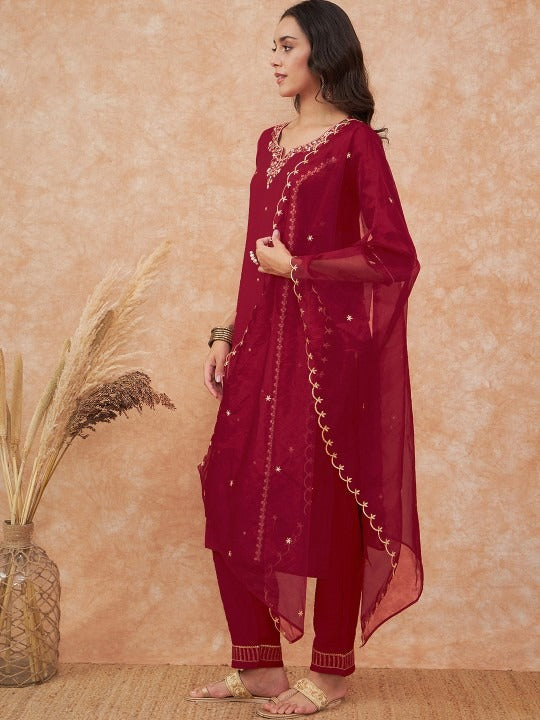 Sangria Maroon Floral Embroidered Straight Kurta With Trousers & Dupatta