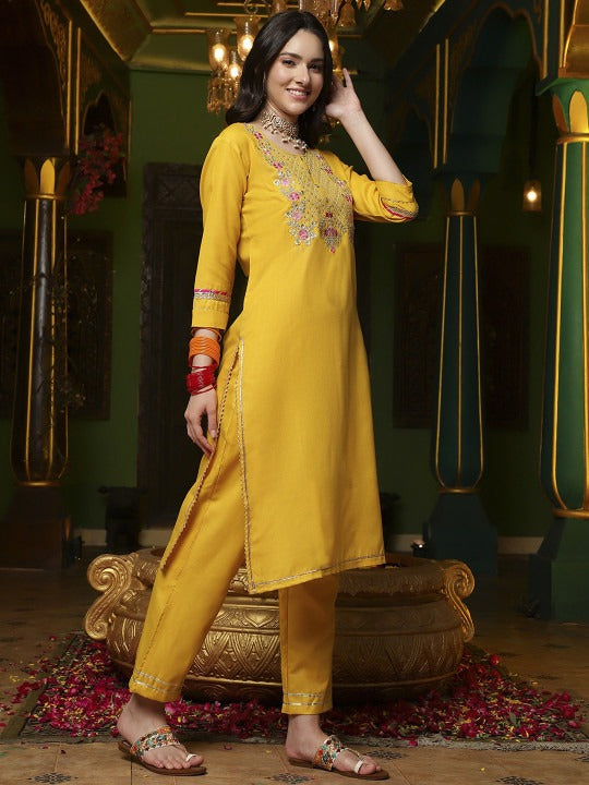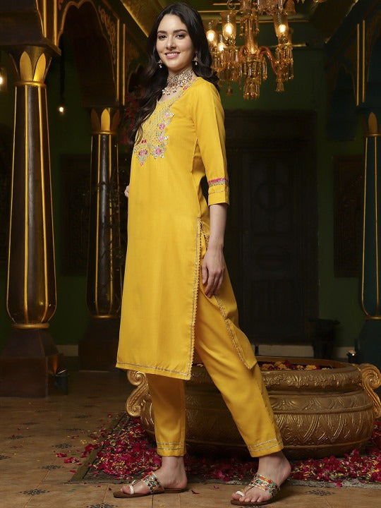 Sangria Yellow Floral Embroidered Gotta Patti Straight Kurta & Trouser With Dupatta