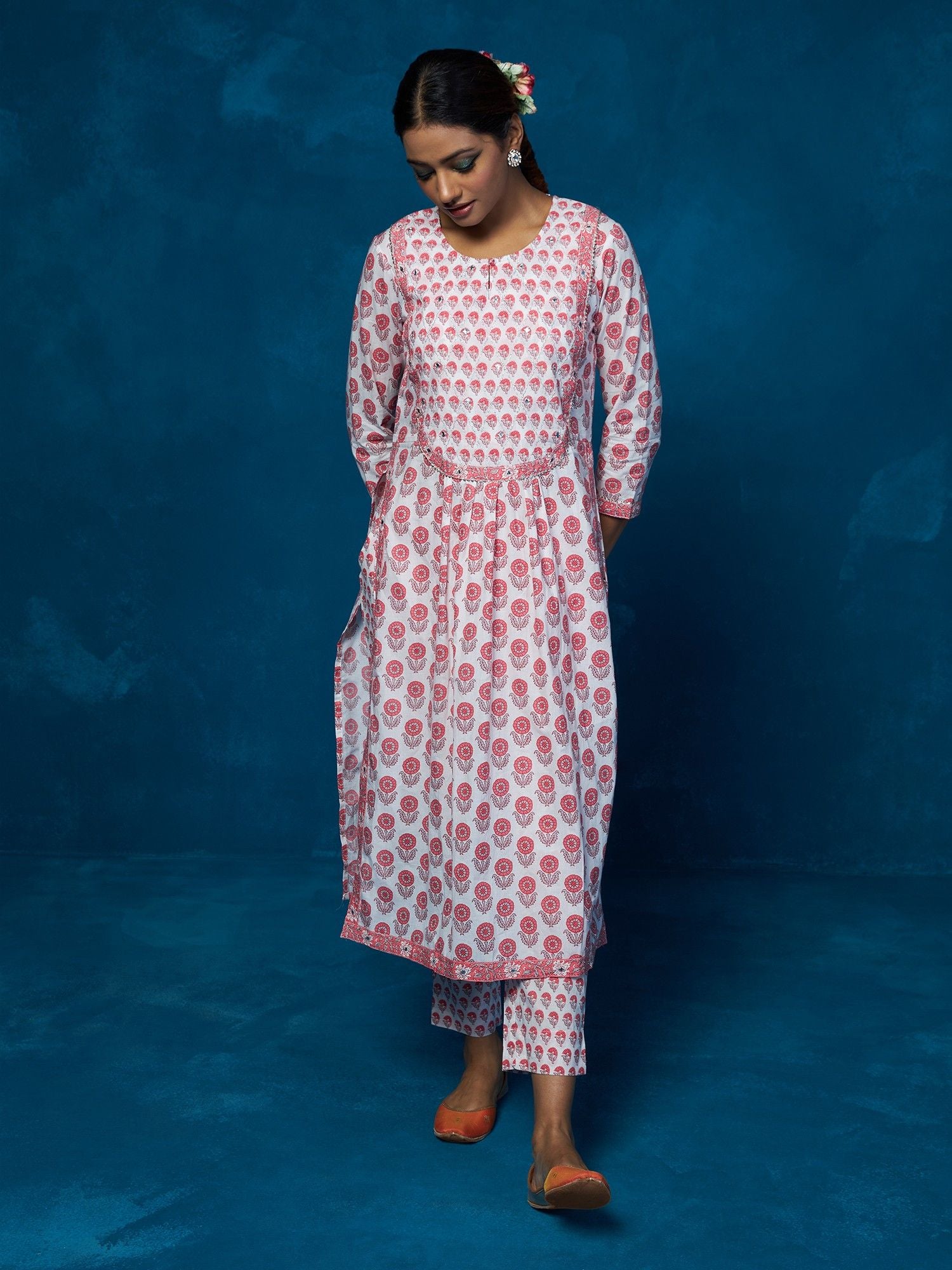 Likha White Floral Hand Block Printed Co-ord Set LIKSKD71 (Set of 2) - M